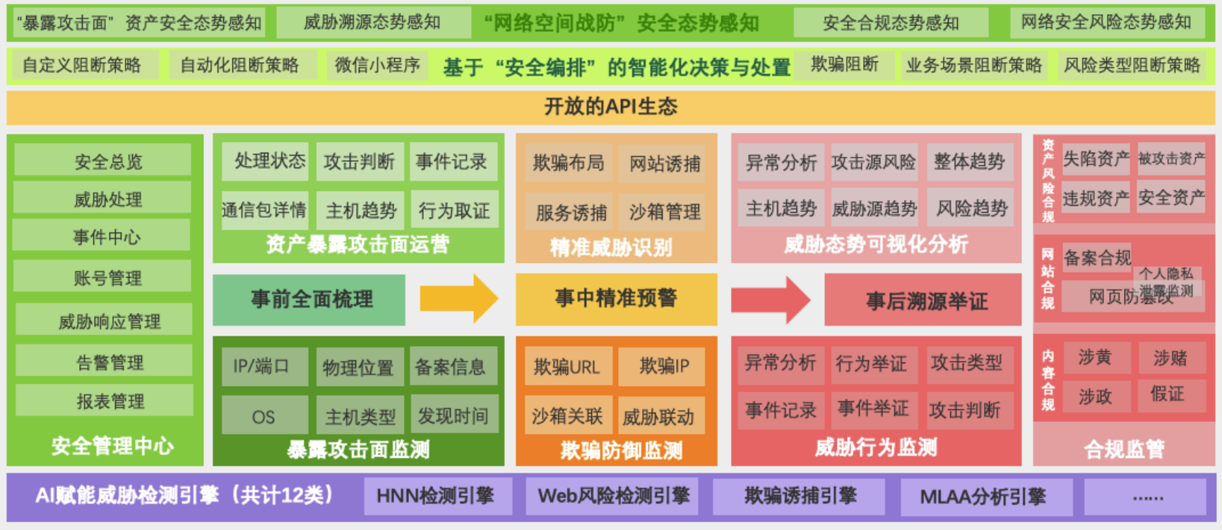 防守方可基于对已知和未知攻击实现智能化决策与自动化安全编排,通过自动化联动处置,缩短响应时间,将安全处置由    “事后”提至“事中” ,实现安全事件检测与响应闭环化管理 。